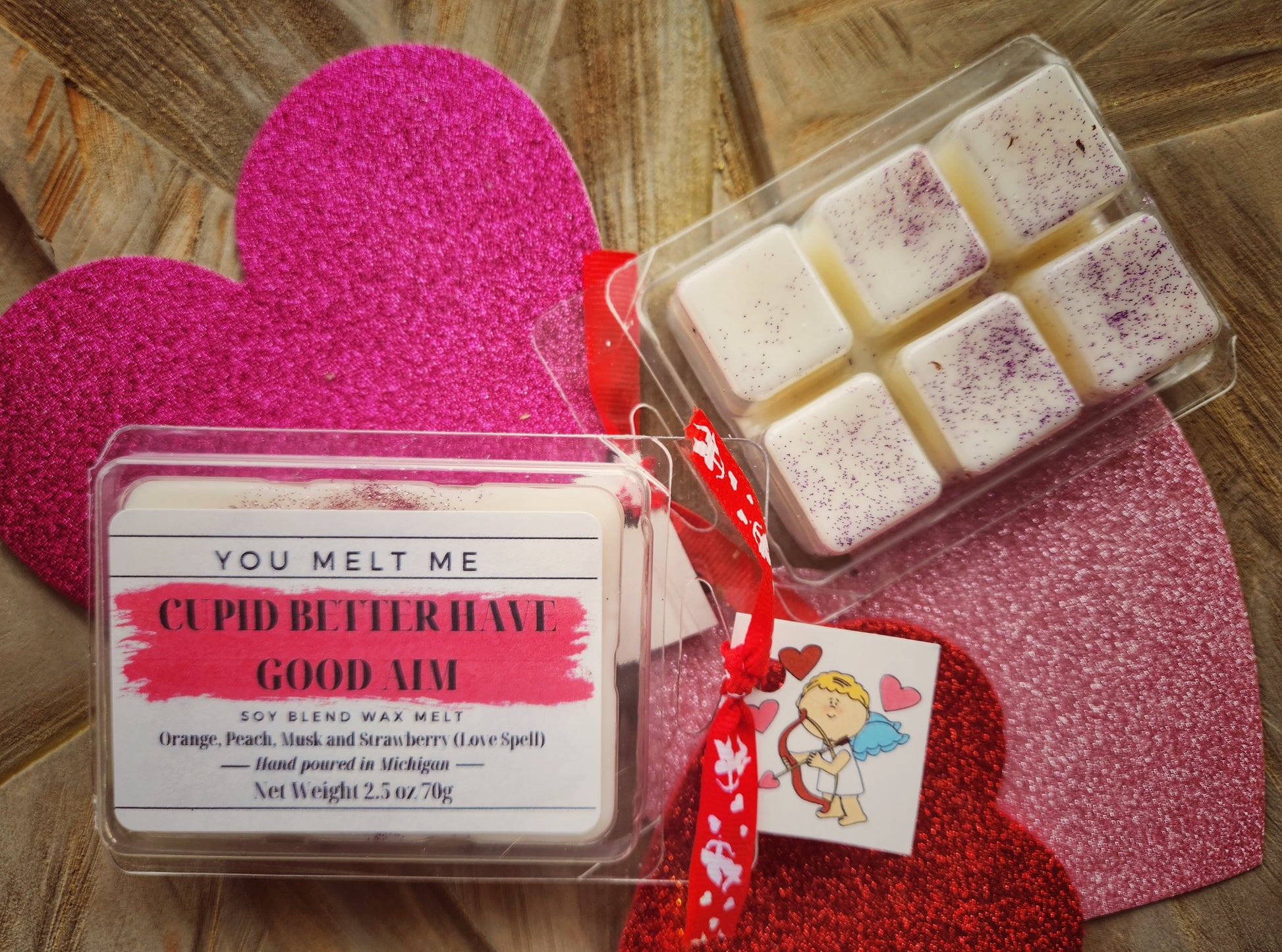 Let's hope Cupid's arrow find it's way to your true love. If he's got bad aim, well...This melt blends the aromas of orange, peach, strawberry and musk. This scent is a dupe of a popular scent named Love Spell