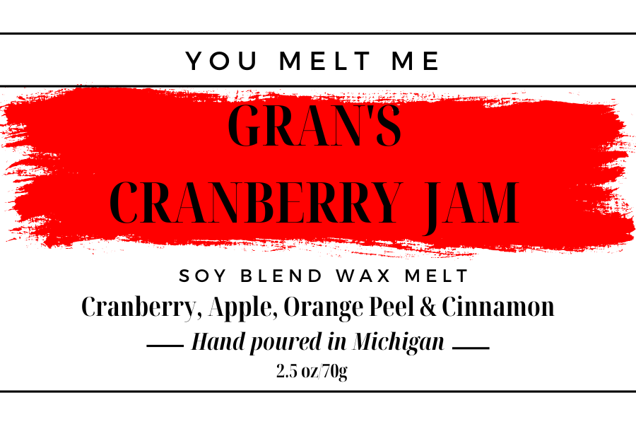Gran is not slowing down one bit and still likes to shake it. However, she does make one mean cranberry jam. Filled with scents of cranberry, apples, orange peel and cinnamon- this melt is not only perfect for holidays, but year round as well. Get your jam on Gran!