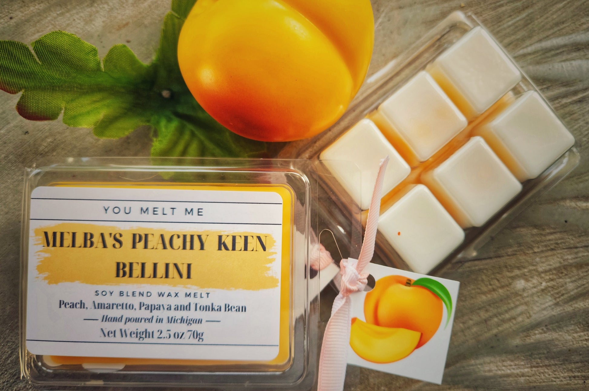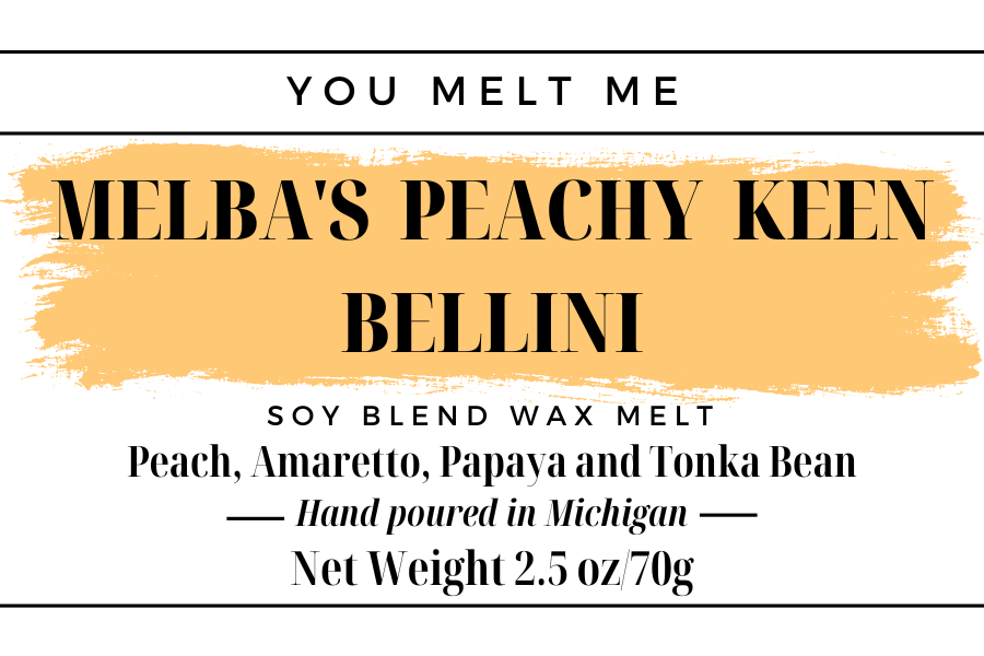 Meet Melba! Peaches smell simply amazing fresh off the tree, as preserves on a fresh piece of toast or jazzed up in a peach bellini. This melt captures the fresh scent of peach perfectly. Added aromas of amaretto, papaya and Tonka bean enhance that fresh peach smell. So please enjoy Melba's Peachy Keen Bellini! It's perfectly peachy!