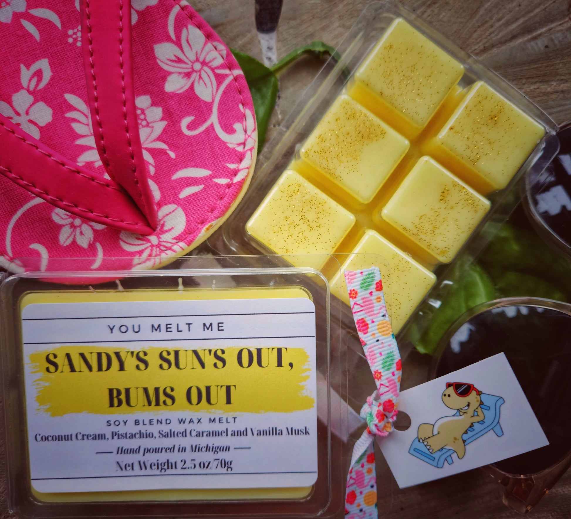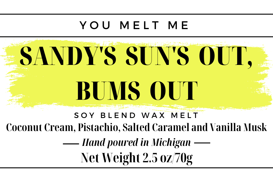 Bask in the sun, beach breezes, sunscreen applied- enjoy that moment. Sandy's Sun's Out, Bums Out smells like a fresh, sweet beach vacation. Inspired by a very popular body product that's out on the market, Sandy's captures that product line perfectly. Coconut cream, pistachio, salted caramel and vanilla musk- this melt screams summer!
