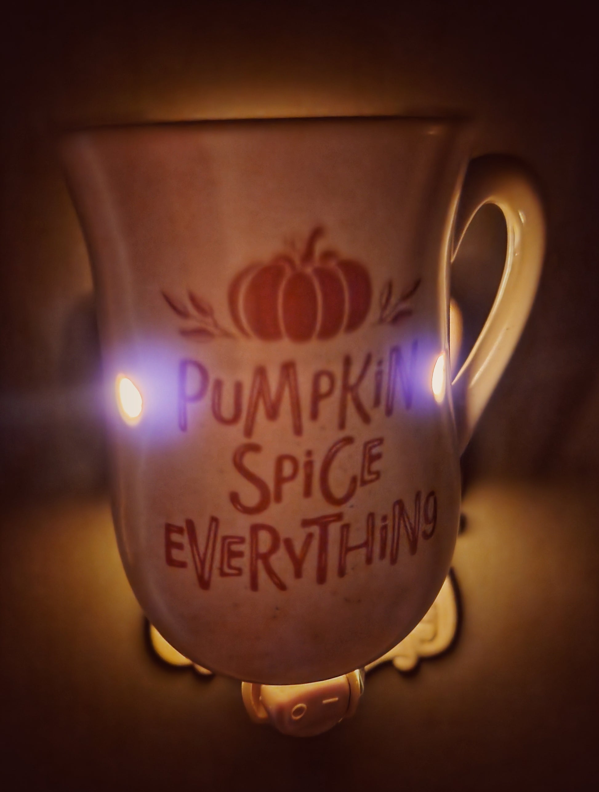 - DESIGN: Bring cozy fall vibes to any room with the Pumpkin Spice Pluggable Fragrance Warmer, a cozy fall essential. Styled like a cream colored coffee mug with “Pumpkin Spice Everything” printed on the side. This warmer effortlessly fills small spaces with your favorite scents, adding autumnal flair and ambiance to your home décor.
