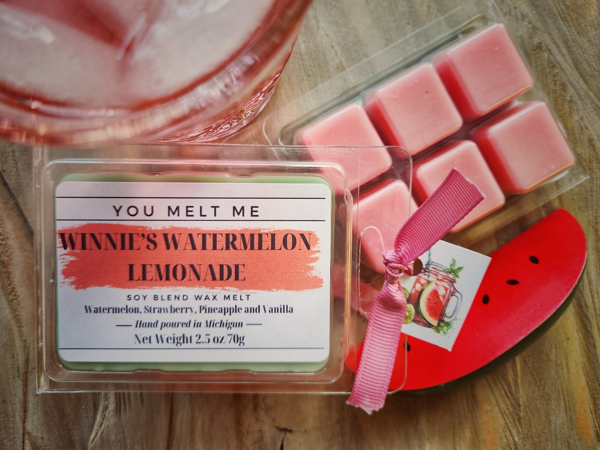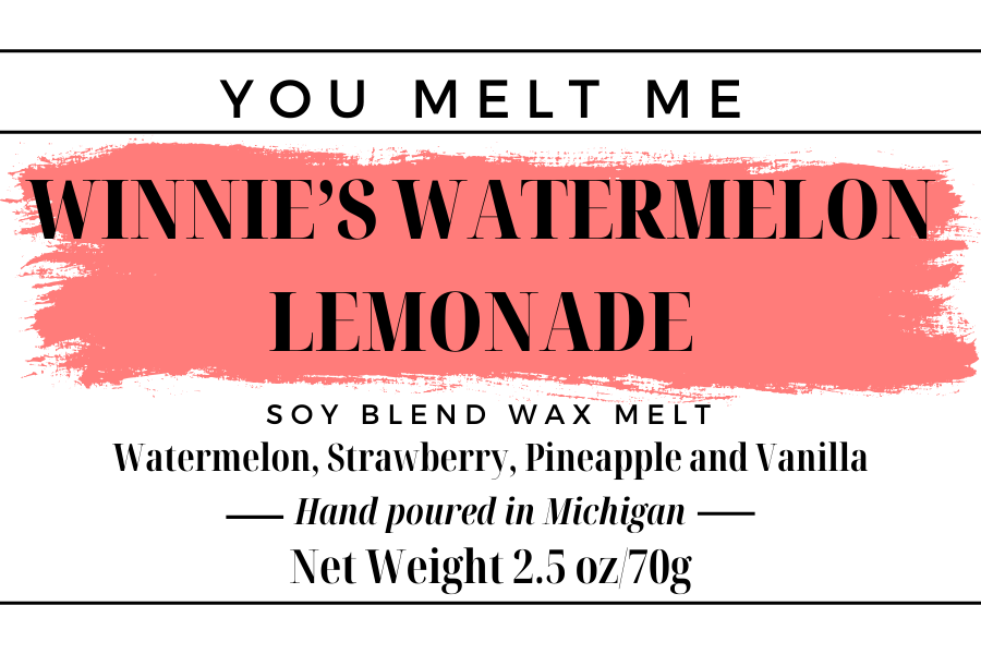 This fresh melt captures that hot, summer breeze refreshments we love; watermelon and lemonade. The refreshing scent of lemonade and the added sweetness of ripe watermelon will make you feel cool...Added are some hints of strawberry, pineapple and vanilla. Try Winnie's Watermelon Lemonade today!